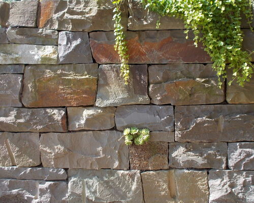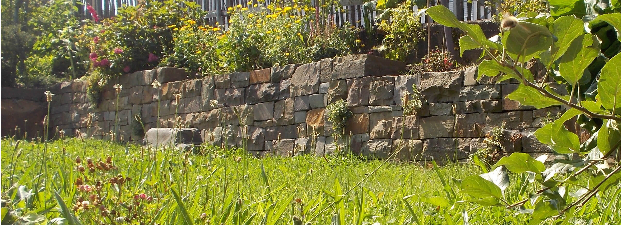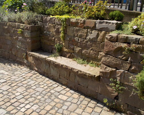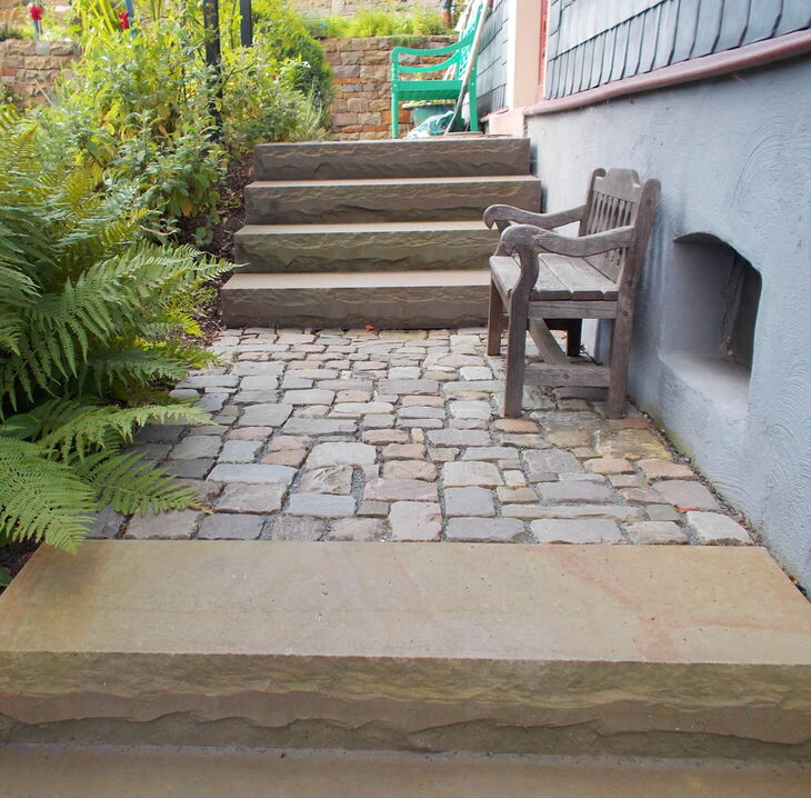 Eingebettet in die üppig bewachsene Umgebung tragen das Wildpflaster, die Blockstufen und die Mauern aus Grauwacke zu einer Atmosphäre von Entschleunigung bei.