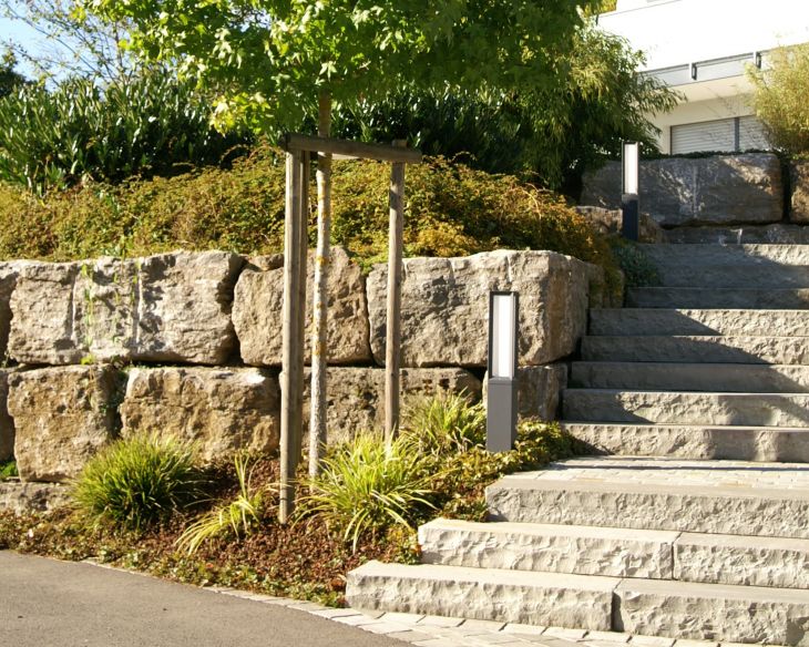 Die Kombination aus Muschelkalk und indischem Quarzit sorgt bei dieser schönen Außenanlage für besondere Hingucker. Zusammen mit der üppigen Bepflanzung ergibt sich ein modernes, natürliches Gesamtbild, das sich nahtlos in die umliegende Natur einfügt.