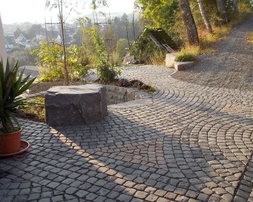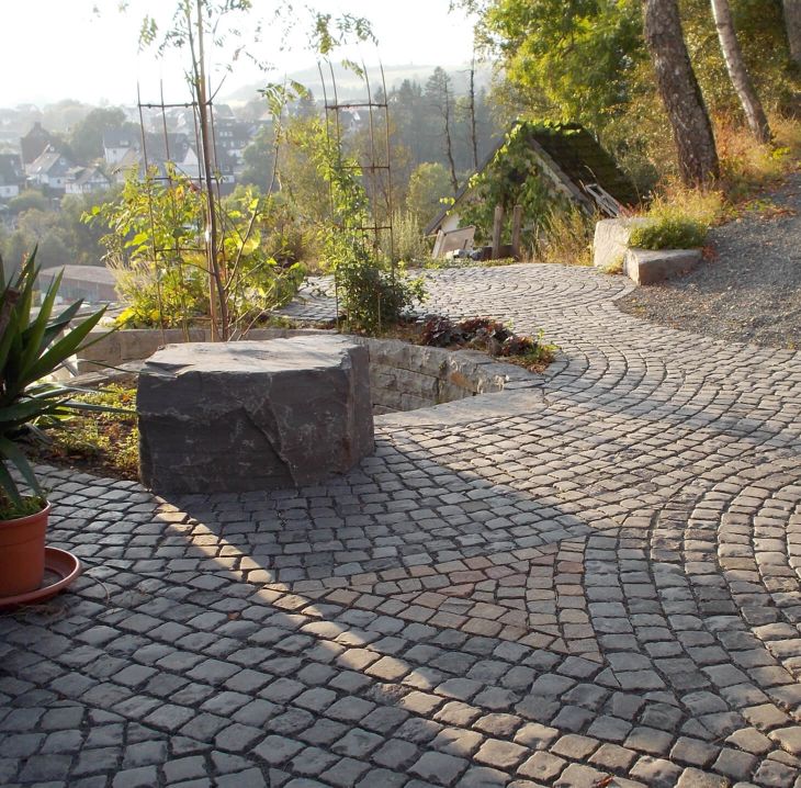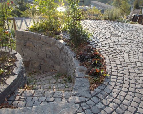 Pflasterflächen aus Naturstein, eine solide Natursteinmauer und eine Treppe aus robustem Stein – diese Elemente verleihen dem Garten eine zeitlose, natürliche Eleganz. Das unregelmäßige Muster der Natursteinpflasterung fügt sich harmonisch in das Gesamtbild ein.