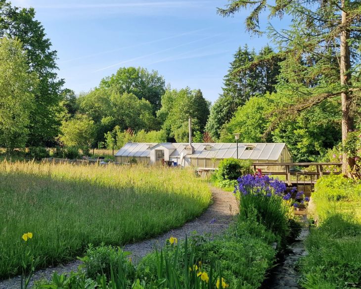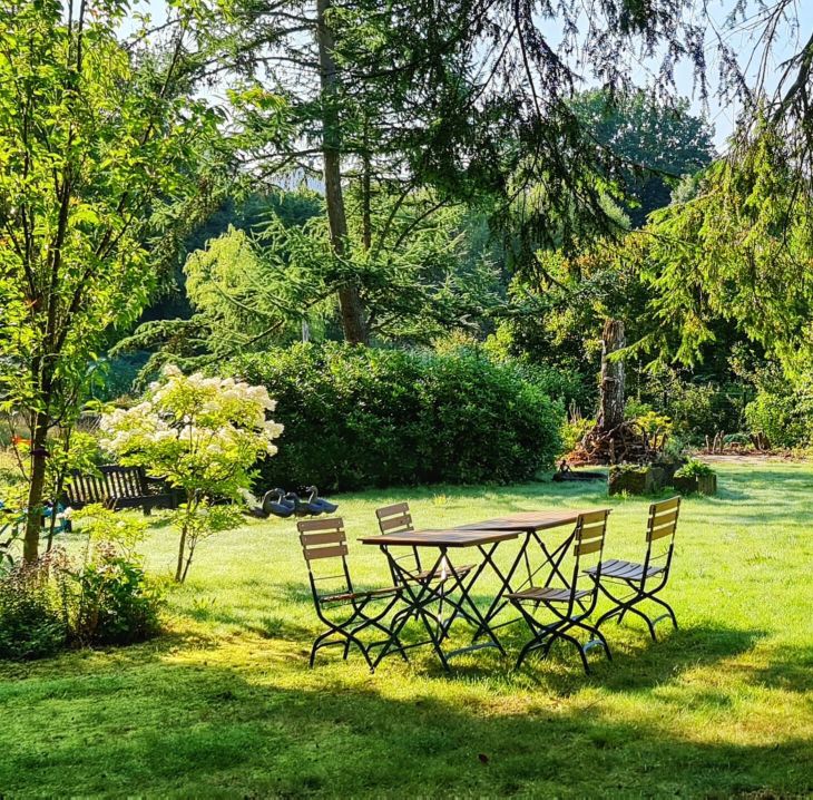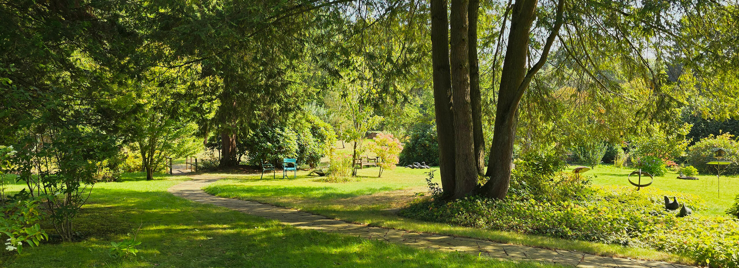 Die Parkanlage mit einem Teich mit natürlicher Lehmbodenabdichtung und dem Natursteinplattenweg aus Grauwacke ist ein Raum, der den Besucher dazu einlädt, den Kopf freizubekommen, die Zeit zu vergessen und sich auf das Wesentliche zu besinnen.