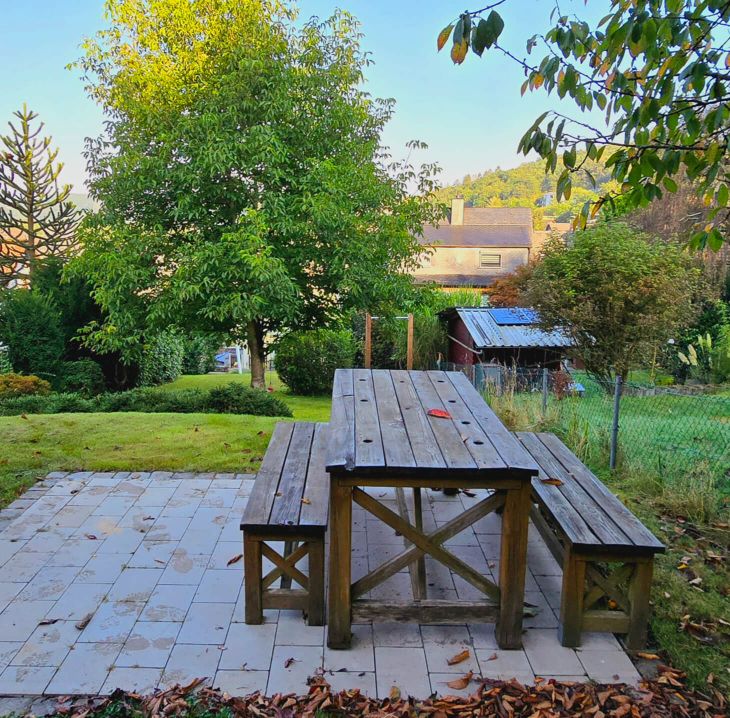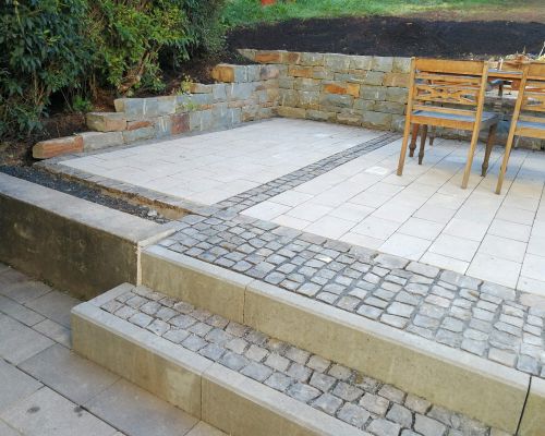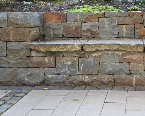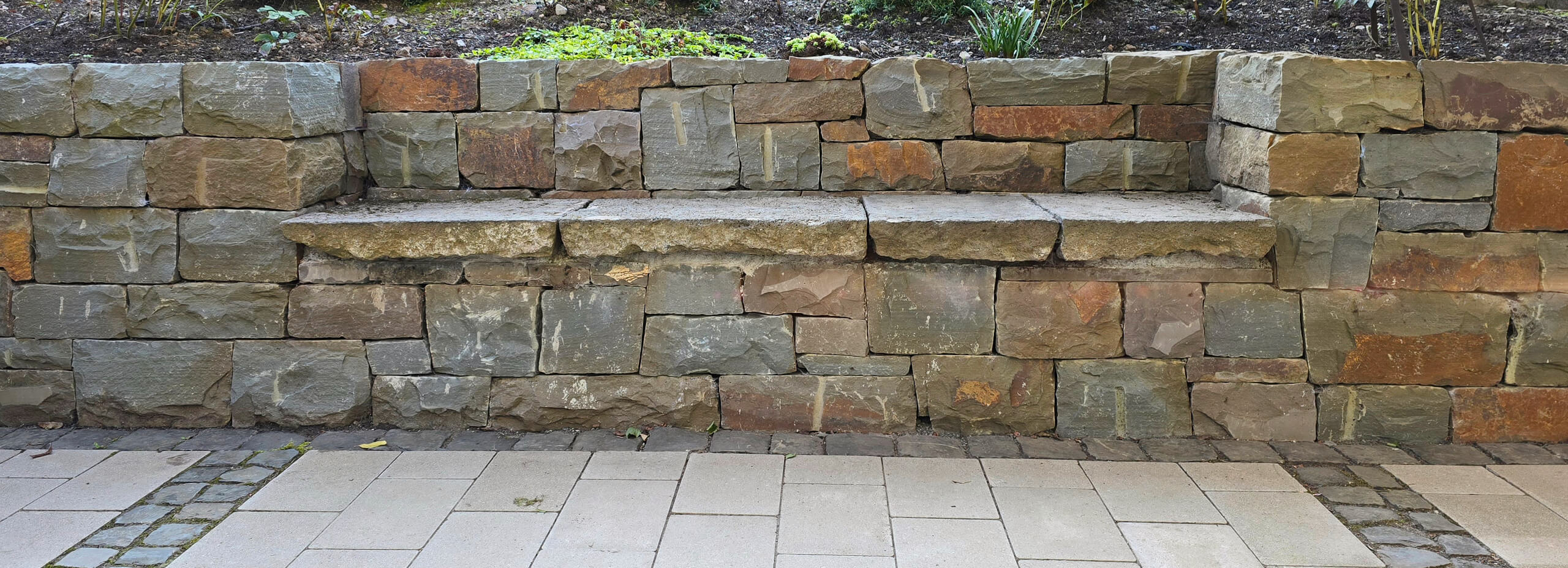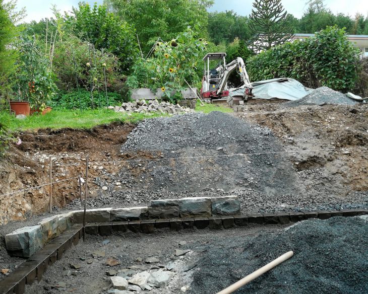 Im Mittelpunkt steht hier die farbenreiche Grauwacke-Trockenmauer. Die Terrasse besteht aus fasenlosem, scharfkantigem Betonpflaster, das durch Bänderungen aus Natursteinpflaster unterteilt wird, was für eine gegliederte Ordnung als auch für eine rustikale Atmosphäre sorgt. Der Bauverlauf ist hier ebenfalls dokumentiert.