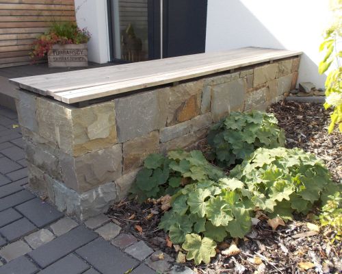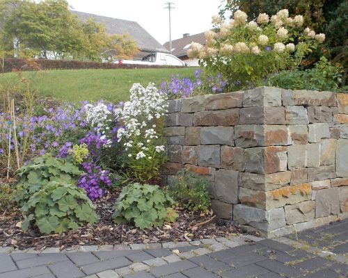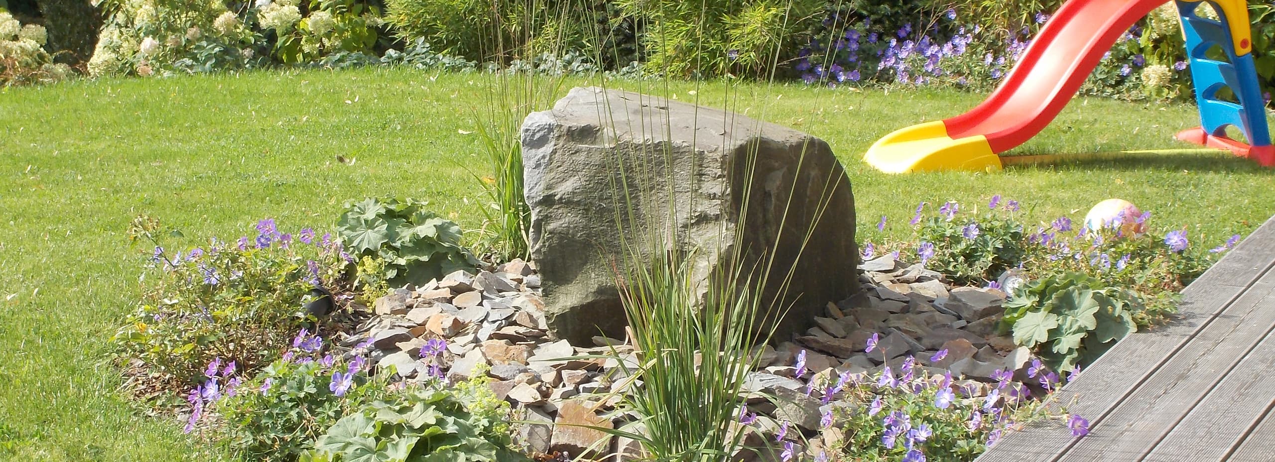 Die Verbindung aus regionaler Lindlarer Grauwacke und der sorgfältig ausgewählten Pflanzenpracht macht aus diesem Garten eine echte Oase zum Entspannen und Erholen. Funktionalität und Optik sind hier im Einklang, der Quellstein aus Grauwacke entpuppt sich als Hingucker, das dem ganzen Garten den letzten Schliff gibt.
