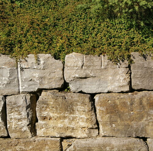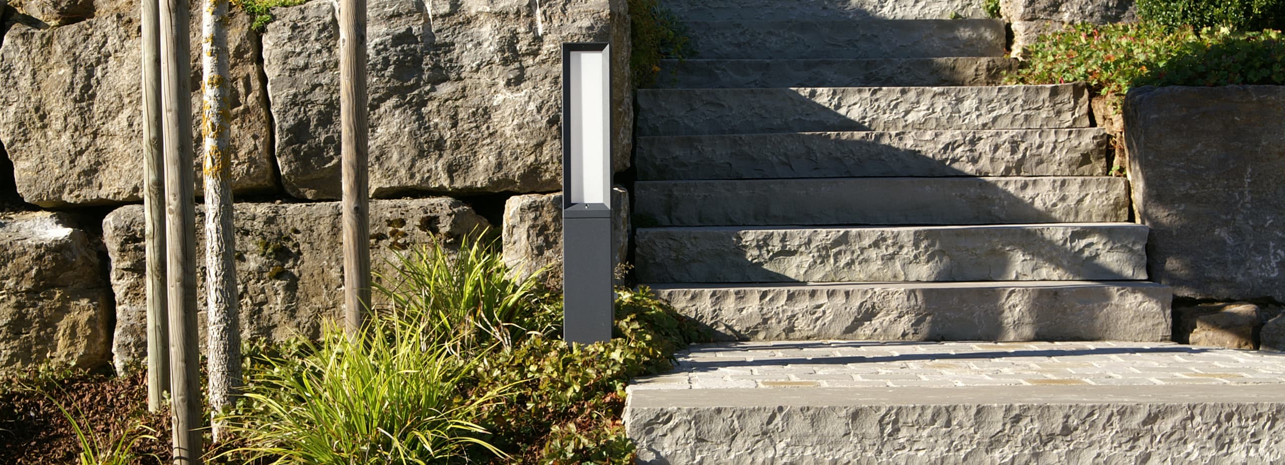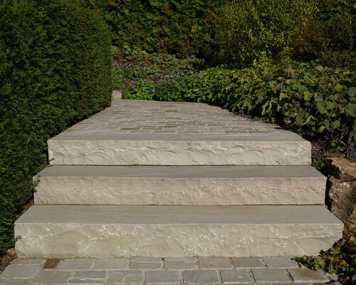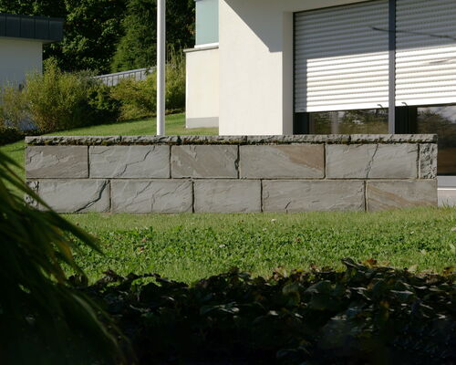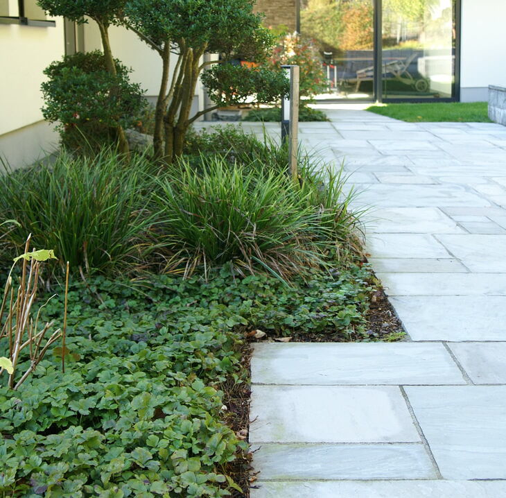 Die Kombination aus Muschelkalk und indischem Quarzit sorgt bei dieser schönen Außenanlage für besondere Hingucker. Zusammen mit der üppigen Bepflanzung ergibt sich ein modernes, natürliches Gesamtbild, das sich nahtlos in die umliegende Natur einfügt.